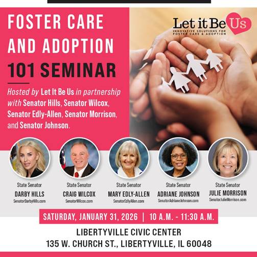 I’m proud to partner with Let It Be Us and fellow legislators for a Foster Care and Adoption 101 Seminar on January 31st from 10:00 a.m. to 11:30 a.m. in Libertyville at the Libertyville Civic Center.